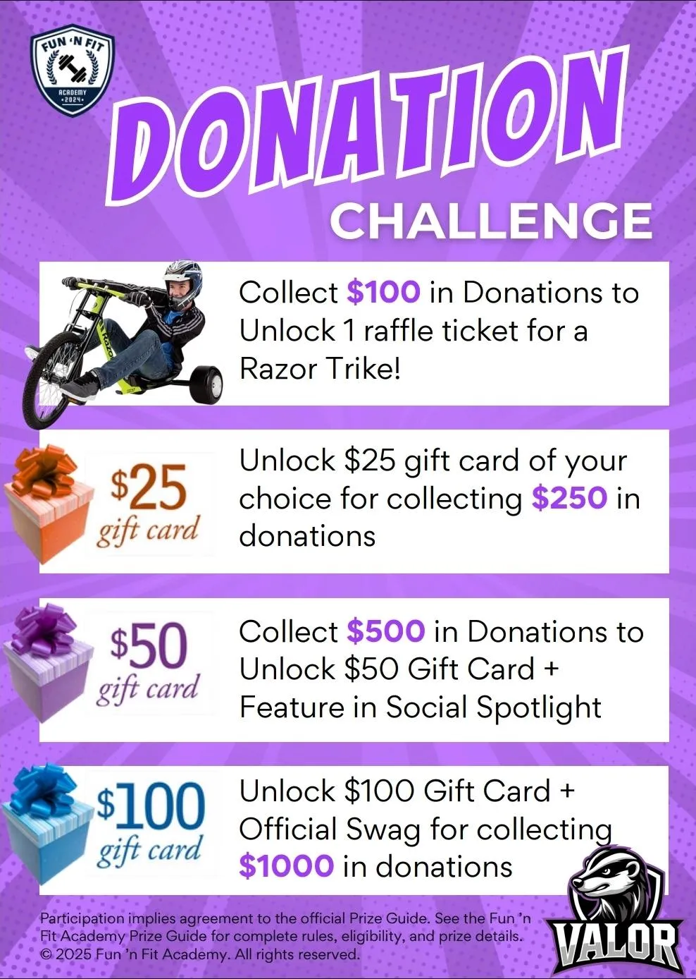 Every dollar supports Fun ’n Fit Academy programs, including: Kids fitness & movement development Leadership & mentorship training